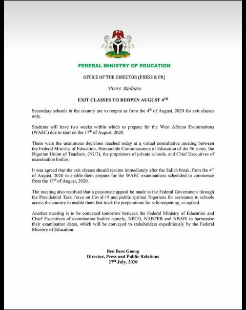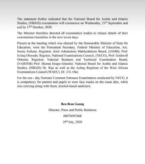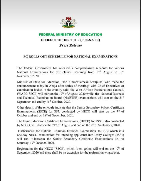 Nigerian govt announces dates for NECO, NABTEB and other examinations.